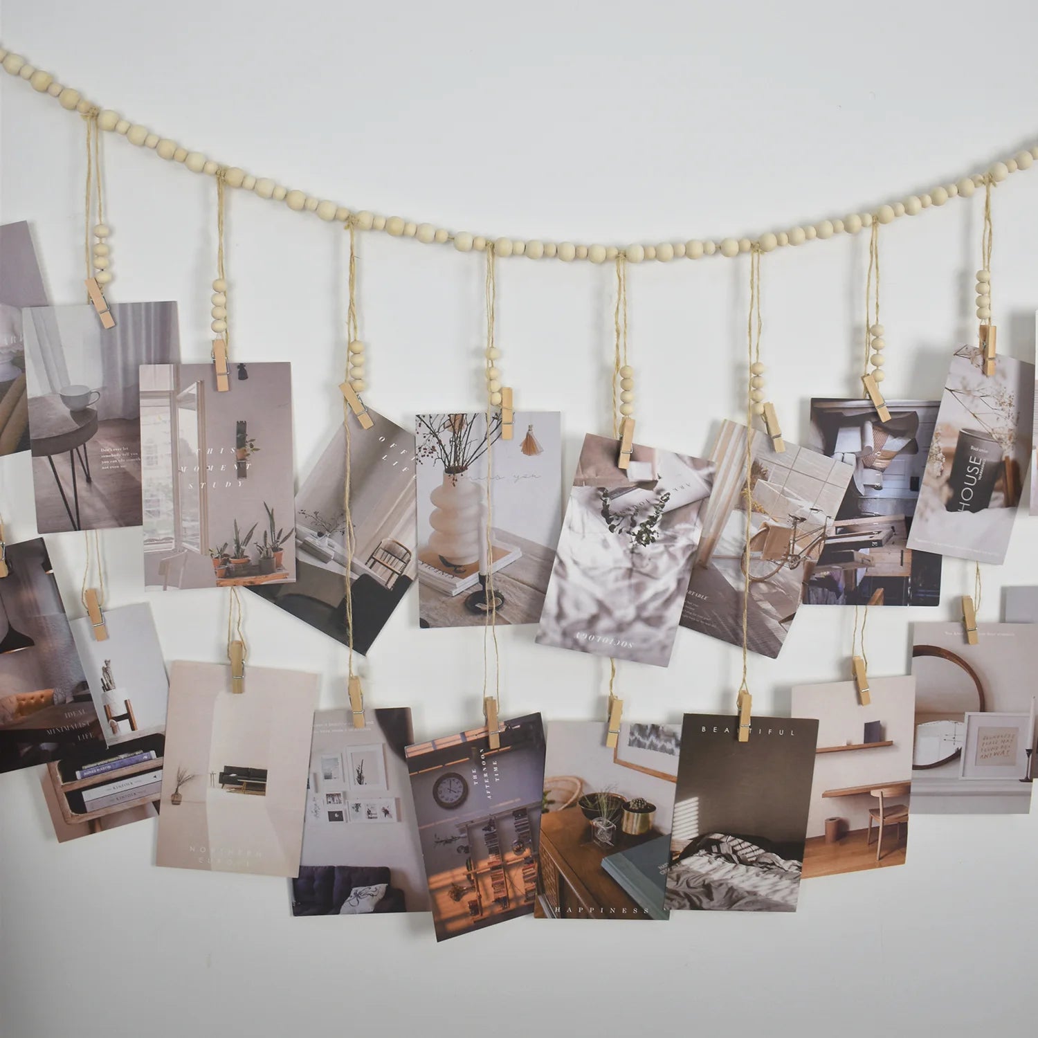 2.The wall art features a chic design using high-quality cotton string threaded through beads and clips as a chain. You can use it to display photos, postcards, children's paintings, greeting cards, or any other cards you wish to showcase on the string. Additionally, it serves as special decorations for themed festivals and parties such as birthdays, Christmas parties,weddings, anniversaries or graduation ceremonies.
